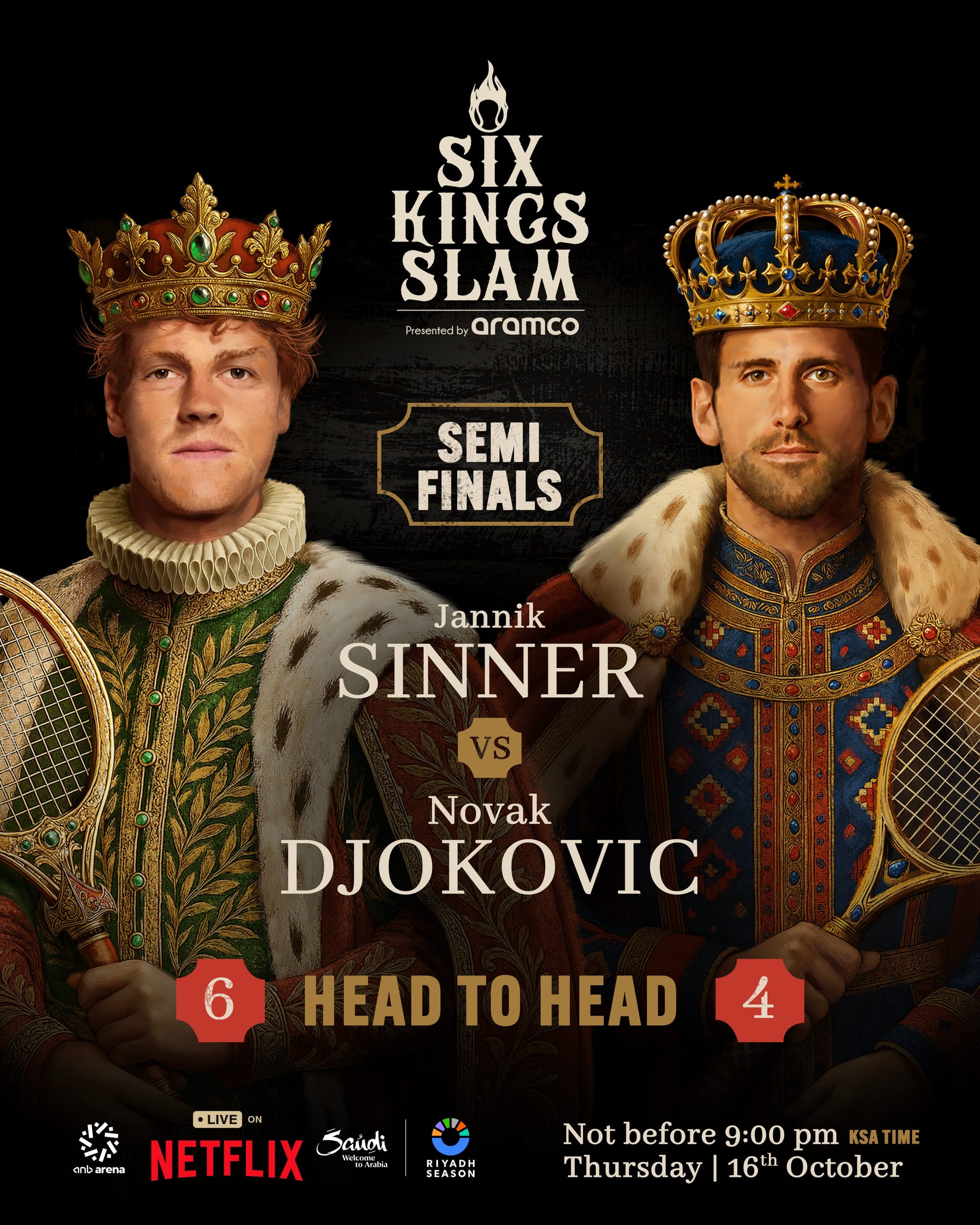 تترقّب جماهير التنس مساء اليوم (الخميس) مواجهة من العيار الثقيل تجمع بين الإيطالي يانِك سينر والصربي نوفاك ديوكوفيتش عند الساعة التاسعة مساءً على أرض صالة ANB أرينا في العاصمة الرياض، ضمن منافسات نصف نهائي بطولة "الملوك الستة" التي تشهد مشاركة نخبة من أبرز نجوم اللعبة حول العالم.
