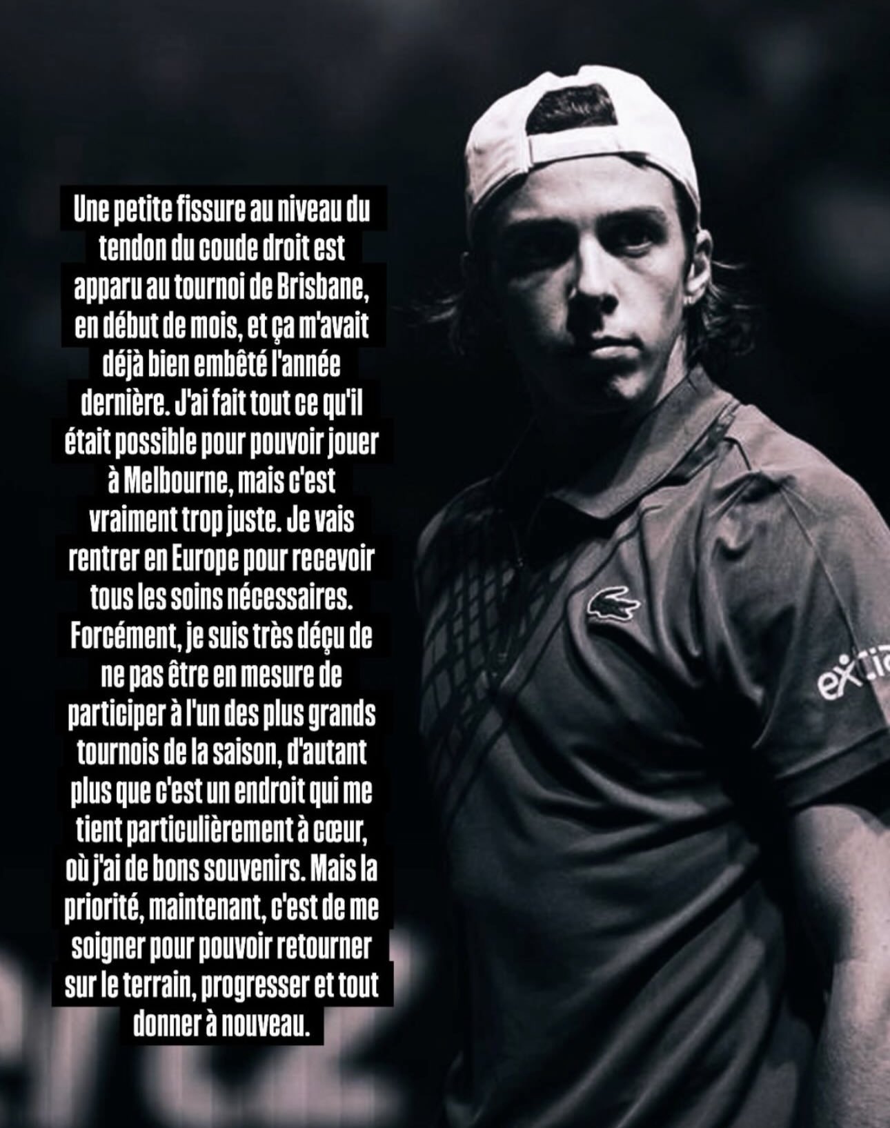 ويمثل هذا الغياب ضربة موجعة للاعب الفرنسي الشاب، الذي كان يطمح إلى تحقيق حضور قوي في أول بطولات الغراند سلام لهذا الموسم.