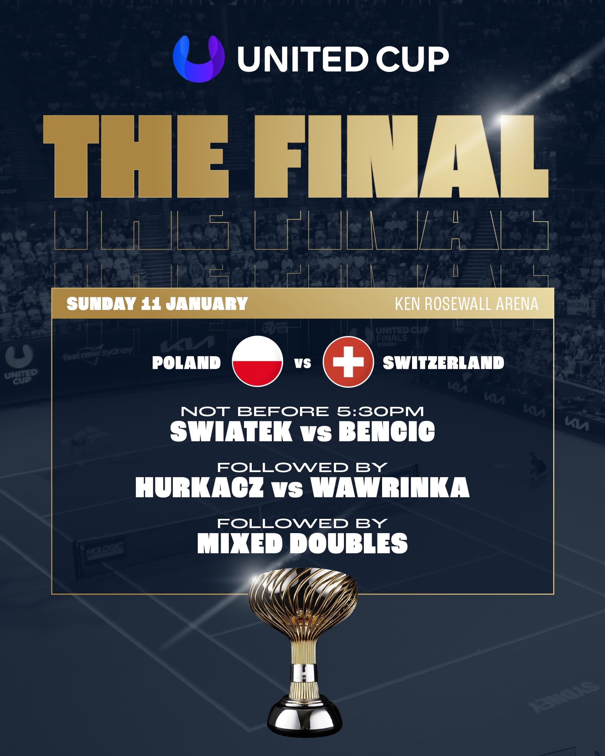تتجه أنظار عشّاق التنس إلى المباراة النهائية لبطولة United Cup 2026، حيث يلتقي منتخبا بولندا وسويسرا في مواجهة مرتقبة تجمع بين الطموح البولندي والخبرة السويسرية، في ختام بطولة اتسمت بالقوة والإثارة منذ دور المجموعات.